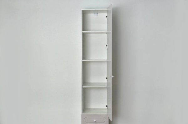 Модуль оснащён одной распашной дверцей и двумя вместительными выкатными ящиками в нижней части, предназначенными для хранения одежды, текстиля или аксессуаров. Внутреннее наполнение можно выбрать в зависимости от потребностей: шкаф может быть укомплектован полками или штангой для плечиков, что делает его удобным для хранения как сложенных вещей, так и одежды на вешалках.