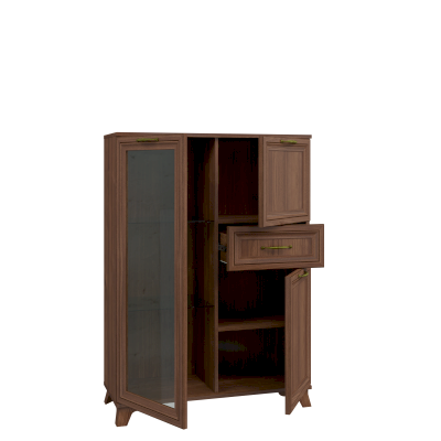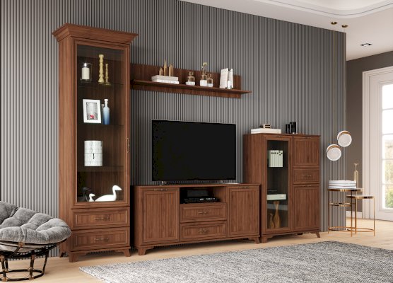 Слева расположены три глубокие ниши со стеклянными полочками, отлично подходящие для хранения книг и декора, а стеклянная дверца оберегает вещи находящиеся внутри от попадания пыли и влаги.