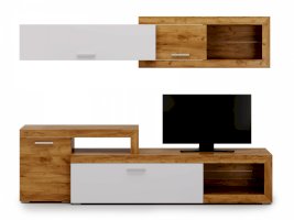 Преимущества: большая ниша для ТВ — для телевизора с диагональю от 50" и больше; стильное исполнение — насыщенный цвет натурального дуба делает мебель максимально привлекательной; настенный модуль — поможет сэкономить драгоценное свободное пространство в комнате, не пренебрегая практичностью. Для изготовления данной модели используется ЛДСП.