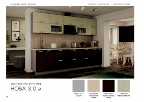 Кухонный гарнитур «Нова» доказывает, что простые вещи могут выглядеть дорого и эксклюзивно. Эффект элитарности достигается благодаря высокому качеству используемых материалов. Глянцевые поверхности смотрятся роскошно. Элегантная фурнитура и стеклянные дверцы подвесных шкафов делают комплект менее тяжеловесным и более утонченным.