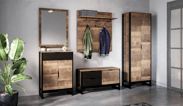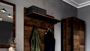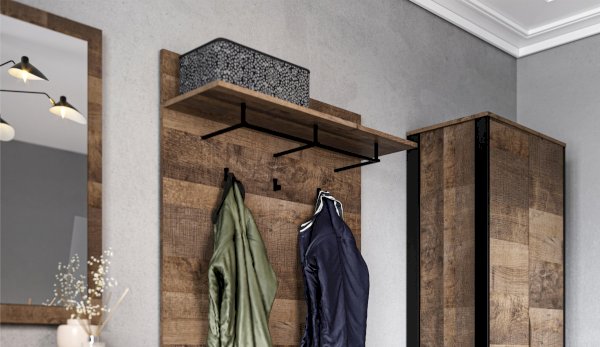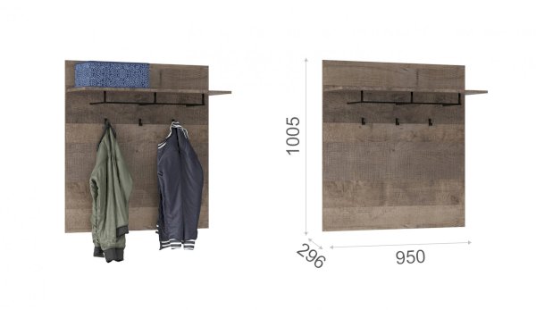 Компактная и функциональная вешалка включает в себя самое необходимое для организации хранения в прихожей. Трендовый декор – «Дуб Гранж» песочного оттенка с реалистичной имитиацией вручную обработанного дерева, выразительными зернистыми текстурами и характерной формой досок, соответствует последним городским тенденциям. Металлическая штанга и три крючка черного цвета поместят на себе одежду объемом с небольшой шкаф. Идеально компонуется со всеми модулями системы Стокгольм. Идеально компонуется со всеми модулями системы Стокгольм.