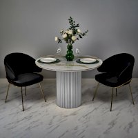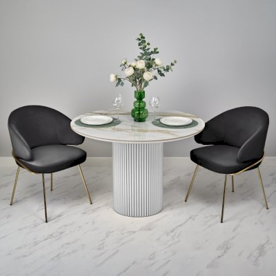 Стильный нераздвижной стол Aura – идеальное сочетание элегантности и функциональности. Стол Aura обладает глянцевой премиальной круглой столешницей из керамики, имитирующей белый мрамор, диаметром 110 см.