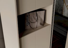 Разделение на секции: Одна часть прихожей включает две одинаковые секции с полками, закрытые створками. В каждой секции предусмотрено по две съёмные полки, что позволяет настраивать пространство под ваши нужды. Открывание створок осуществляется за выступ, что делает использование шкафа более удобным.