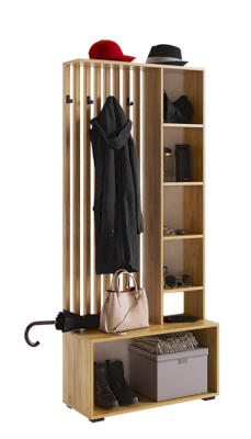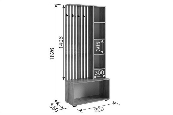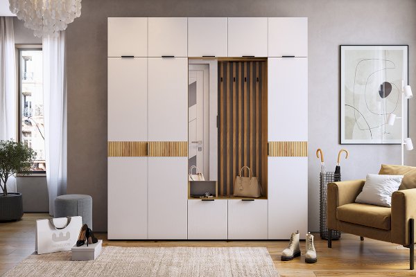 Стильные, трендовые рейки МДФ, акцентные крючки, зеркало, в котором можно себя увидеть в полный рост, полки для мелочей и головных уборов, а так же внузу большой шкаф для обуви, самые актуальные и ценные моменты для прихожей.