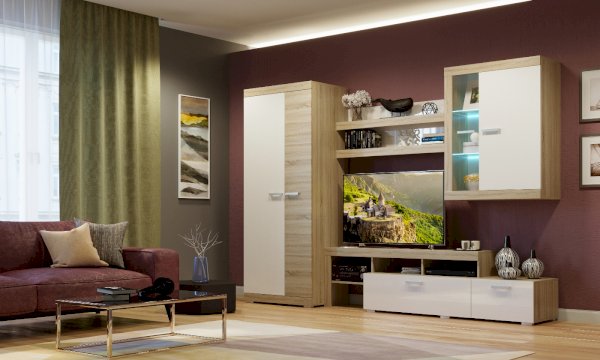В гостиной Соната применяются современные европейские декоры: корпус выполнен из ЛДСП Дуб сонома, фасад из ЛДСП Белый глянец. Декоры отличаются выраженной тёплой древесной текстурой, а фасадная часть подчёркнута горизонтальными линиями текстуры и стильными планками МДФ, представляющими собой элементы корпуса и фасада.